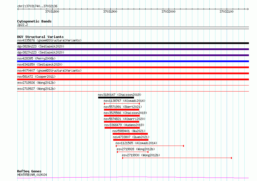Variant DetailsVariant: essv6693108| Internal ID | 10107227 | | Landmark | | | Location Information | | | Cytoband | 2p22.2 | | Allele length | | Assembly | Allele length | | hg38 | 397 | | hg19 | 397 |