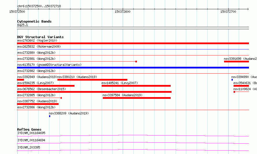 | Variant Type | CNV deletion | Copy Number | | Allele State | | Allele Origin | | Probe Count | | Validation Flag | | Merged Status | S | Merged Variants | esv2732880, esv2732886 | Supporting Variants | | Samples | SSM037 | Known Genes | IYD | Method | Sequencing | Analysis | Breakdancer:4 times standard deviation,VariationHunter:4 times standard deviation and at least 3 supportting reads | Platform | Illumina HiSeq 2000 | Comments | | Reference | Wong_et_al_2012b | Pubmed ID | 23290073 | Accession Number(s) | essv6694272