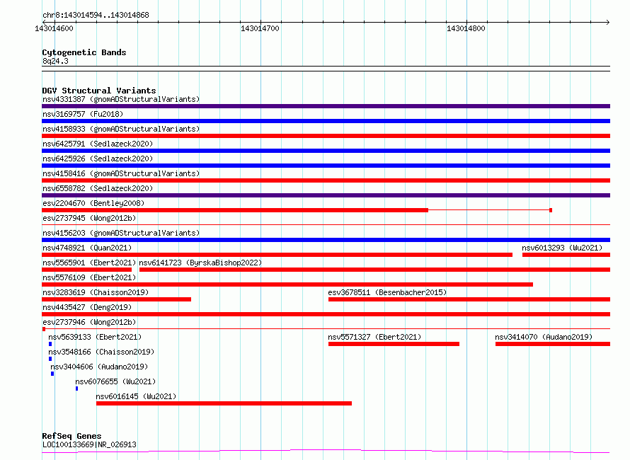 Variant DetailsVariant: essv6694963| Internal ID | 10107579 | | Landmark | | | Location Information | | | Cytoband | 8q24.3 | | Allele length | | Assembly | Allele length | | hg38 | 275 | | hg19 | 275 |