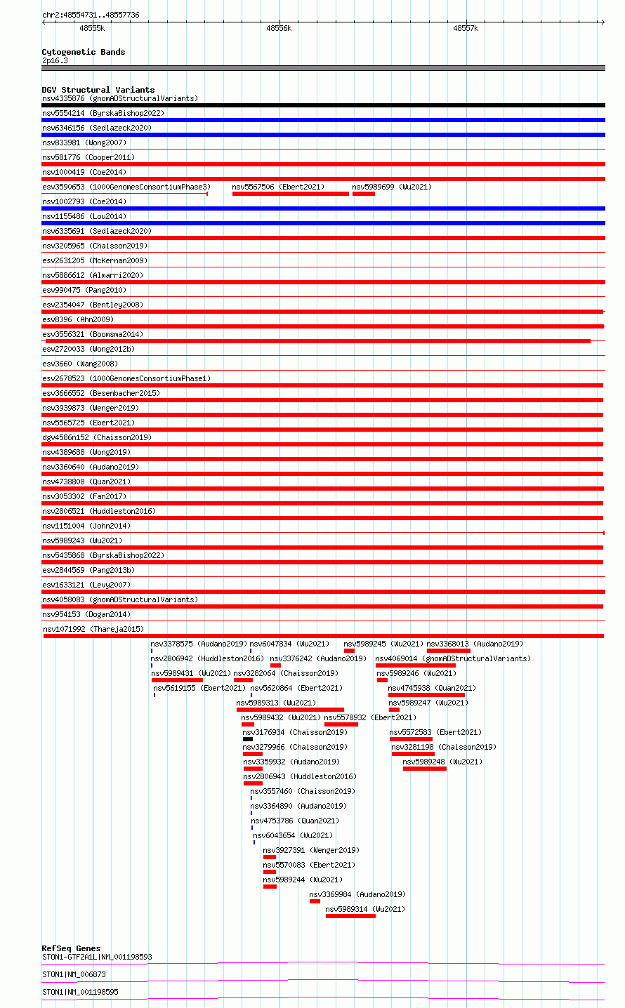 Variant DetailsVariant: essv6697199| Internal ID | 10111685 | | Landmark | | | Location Information | | | Cytoband | 2p16.3 | | Allele length | | Assembly | Allele length | | hg38 | 3006 | | hg19 | 3006 |