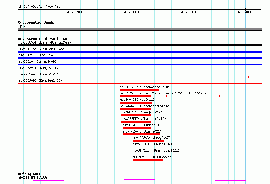 Variant DetailsVariant: essv6697921| Internal ID | 10112369 | | Landmark | | | Location Information | | | Cytoband | 6p12.3 | | Allele length | | Assembly | Allele length | | hg38 | 426 | | hg19 | 426 |