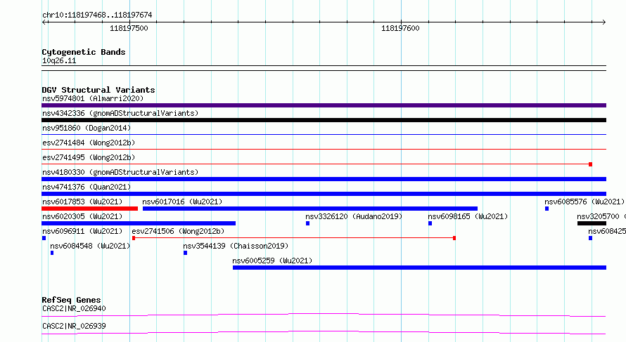 Variant DetailsVariant: essv6698583| Internal ID | 10111434 | | Landmark | | | Location Information | | | Cytoband | 10q26.11 | | Allele length | | Assembly | Allele length | | hg38 | 207 | | hg19 | 207 |
