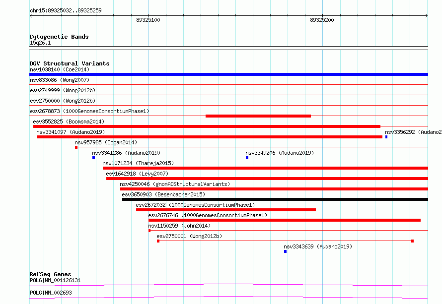 | | Variant Type | CNV deletion | | Copy Number | | | Allele State | | | Allele Origin | | | Probe Count | | | Validation Flag | | | Merged Status | S | | Merged Variants | esv2750000, esv2749999 | | Supporting Variants | | | Samples | SSM038 | | Known Genes | POLG | | Method | Sequencing | | Analysis | Breakdancer:4 times standard deviation,VariationHunter:4 times standard deviation and at least 3 supportting reads | | Platform | Illumina HiSeq 2000 | | Comments | | | Reference | Wong_et_al_2012b | | Pubmed ID | 23290073 | | Accession Number(s) | essv6699052