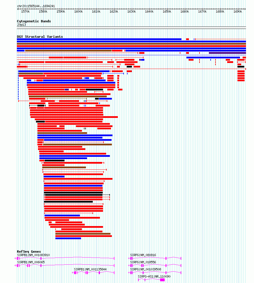 | | Variant Type | CNV deletion | | Copy Number | | | Allele State | | | Allele Origin | | | Probe Count | | | Validation Flag | | | Merged Status | S | | Merged Variants | esv2722071 | | Supporting Variants | | | Samples | SSM038 | | Known Genes | SIRPB1, SIRPG | | Method | Sequencing | | Analysis | Breakdancer:4 times standard deviation,VariationHunter:4 times standard deviation and at least 3 supportting reads | | Platform | Illumina HiSeq 2000 | | Comments | | | Reference | Wong_et_al_2012b | | Pubmed ID | 23290073 | | Accession Number(s) | essv6699313