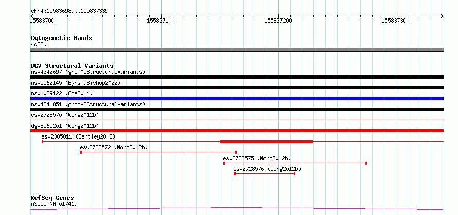 | | Variant Type | CNV deletion | | Copy Number | | | Allele State | | | Allele Origin | | | Probe Count | | | Validation Flag | | | Merged Status | S | | Merged Variants | esv2728570, esv2728571 | | Supporting Variants | | | Samples | SSM039 | | Known Genes | ASIC5 | | Method | Sequencing | | Analysis | Breakdancer:4 times standard deviation,VariationHunter:4 times standard deviation and at least 3 supportting reads | | Platform | Illumina HiSeq 2000 | | Comments | | | Reference | Wong_et_al_2012b | | Pubmed ID | 23290073 | | Accession Number(s) | essv6700622