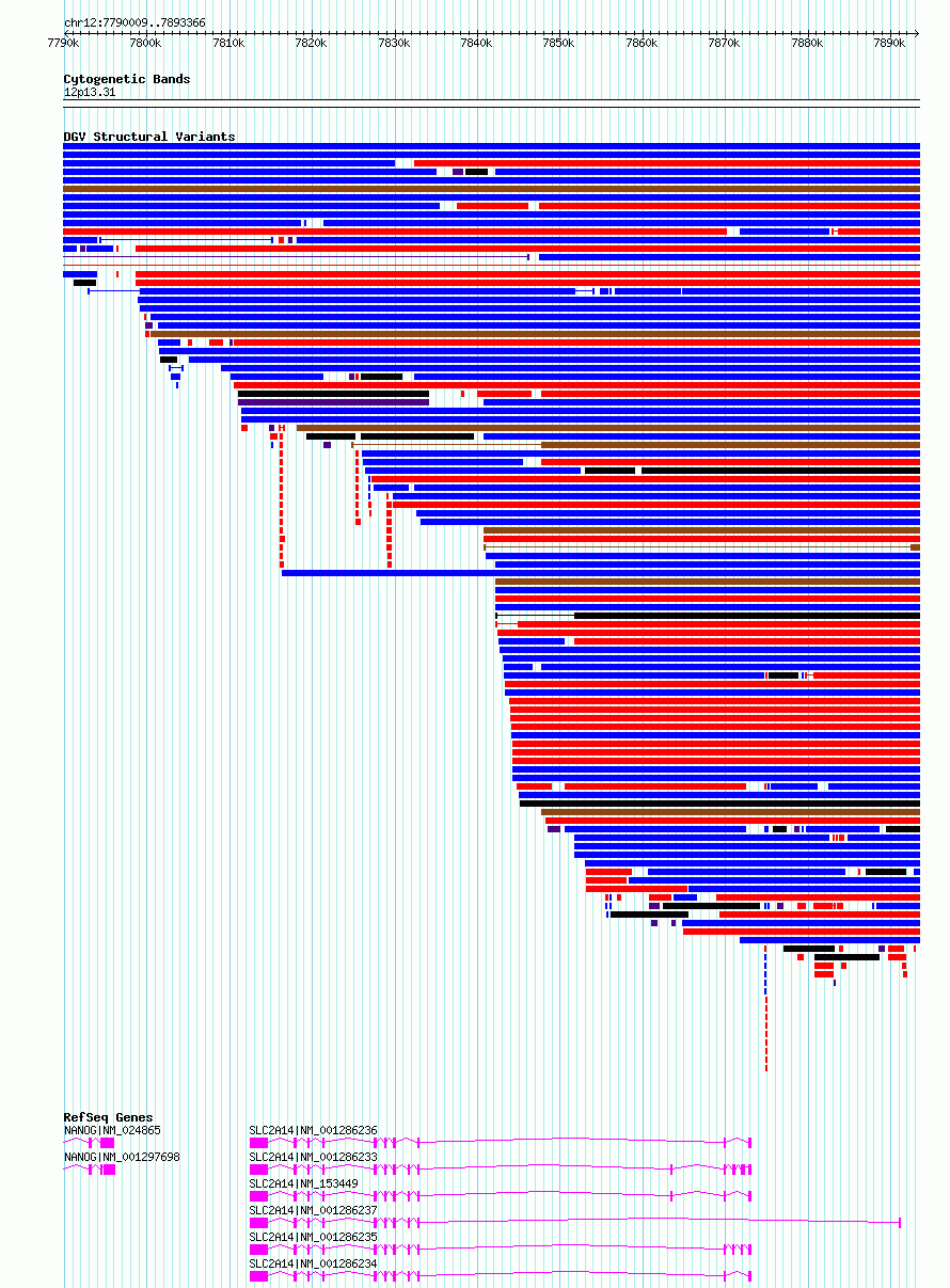| | Variant Type | CNV deletion | | Copy Number | | | Allele State | | | Allele Origin | | | Probe Count | | | Validation Flag | | | Merged Status | S | | Merged Variants | esv2745493 | | Supporting Variants | | | Samples | SSM039 | | Known Genes | NANOG, SLC2A14 | | Method | Sequencing | | Analysis | Breakdancer:4 times standard deviation,VariationHunter:4 times standard deviation and at least 3 supportting reads | | Platform | Illumina HiSeq 2000 | | Comments | | | Reference | Wong_et_al_2012b | | Pubmed ID | 23290073 | | Accession Number(s) | essv6702417