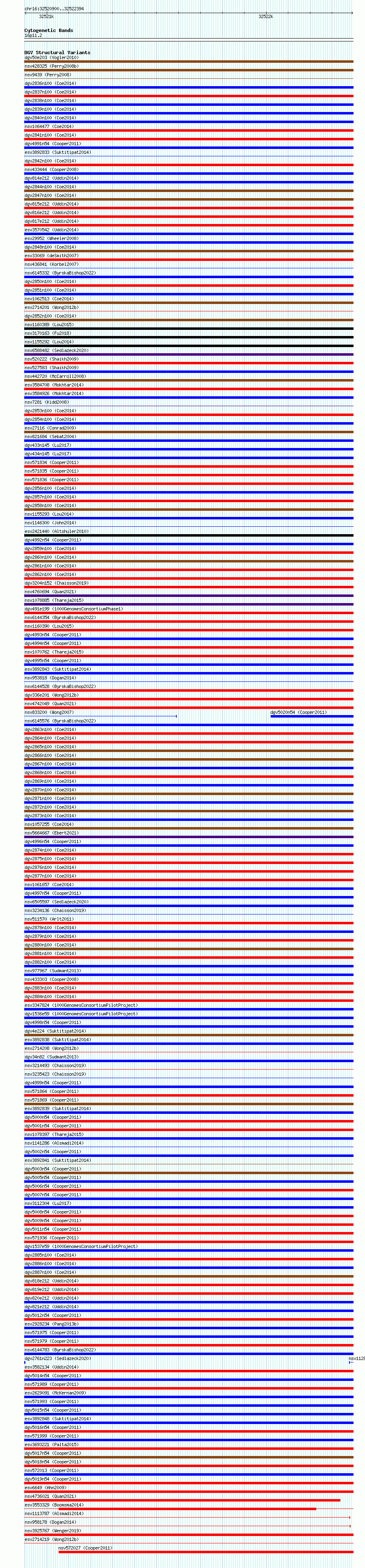 Variant DetailsVariant: essv6702966| Internal ID | 10114839 | | Landmark | | | Location Information | | | Cytoband | 16p11.2 | | Allele length | | Assembly | Allele length | | hg38 | 1495 | | hg19 | 1495 |
