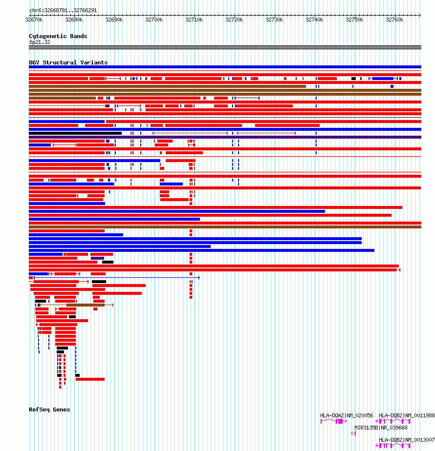 | | Variant Type | CNV deletion | | Copy Number | | | Allele State | | | Allele Origin | | | Probe Count | | | Validation Flag | | | Merged Status | S | | Merged Variants | esv2731866, esv2731868, esv2731864 | | Supporting Variants | | | Samples | SSM006 | | Known Genes | HLA-DQA2, HLA-DQB2 | | Method | Sequencing | | Analysis | Breakdancer:4 times standard deviation,VariationHunter:4 times standard deviation and at least 3 supportting reads | | Platform | Illumina HiSeq 2000 | | Comments | | | Reference | Wong_et_al_2012b | | Pubmed ID | 23290073 | | Accession Number(s) | essv6703809