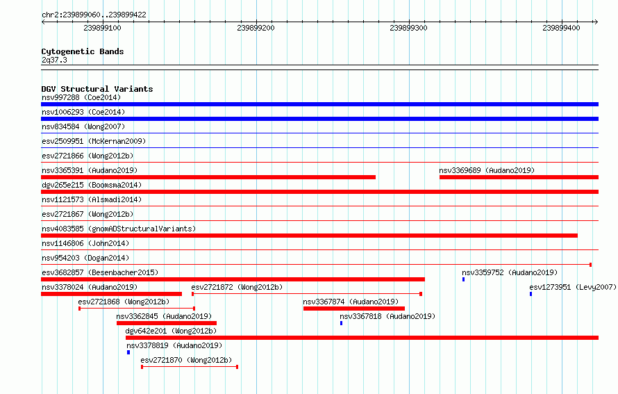 Variant DetailsVariant: essv6704272| Internal ID | 9770640 | | Landmark | | | Location Information | | | Cytoband | 2q37.3 | | Allele length | | Assembly | Allele length | | hg38 | 363 | | hg19 | 363 |