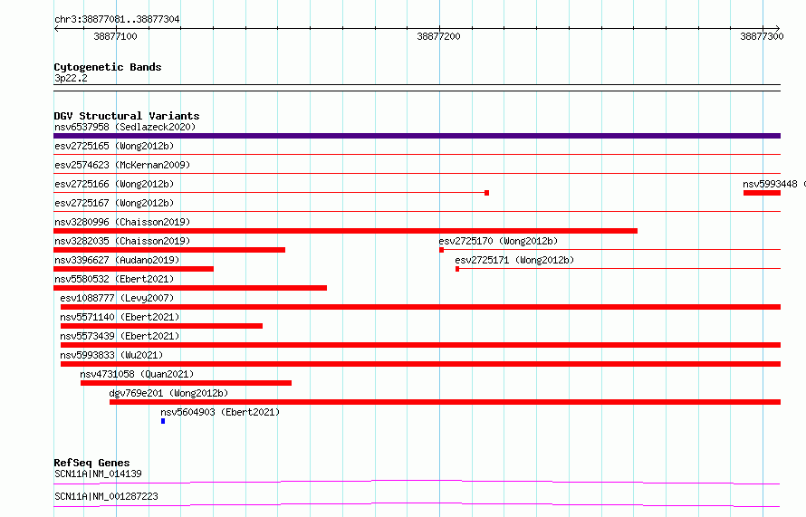 | | Variant Type | CNV deletion | | Copy Number | | | Allele State | | | Allele Origin | | | Probe Count | | | Validation Flag | | | Merged Status | S | | Merged Variants | esv2725165, esv2725167 | | Supporting Variants | | | Samples | SSM040 | | Known Genes | SCN11A | | Method | Sequencing | | Analysis | Breakdancer:4 times standard deviation,VariationHunter:4 times standard deviation and at least 3 supportting reads | | Platform | Illumina HiSeq 2000 | | Comments | | | Reference | Wong_et_al_2012b | | Pubmed ID | 23290073 | | Accession Number(s) | essv6704312