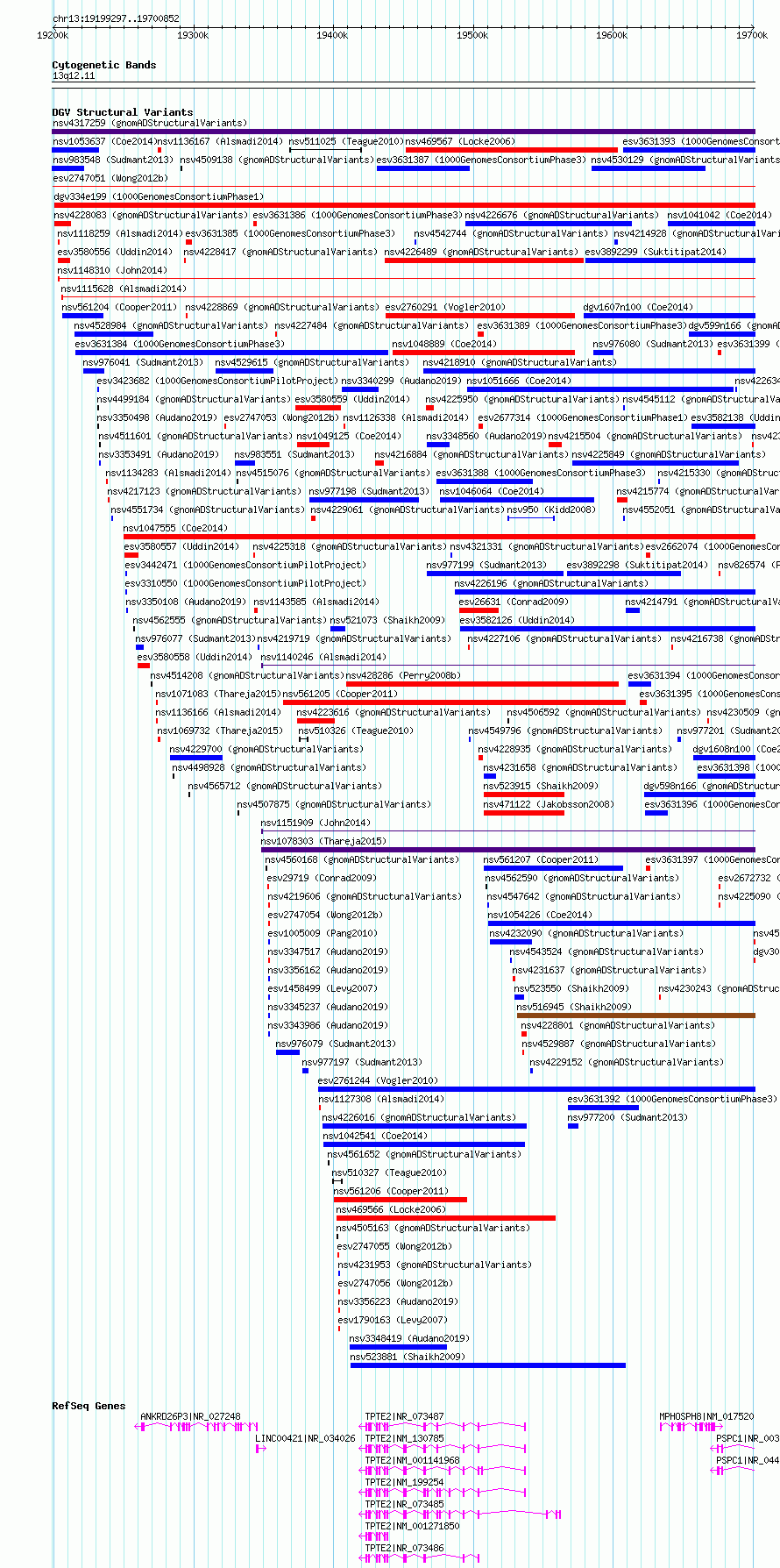 Variant DetailsVariant: essv6706315| Internal ID | 9772479 | | Landmark | | | Location Information | | | Cytoband | 13q12.11 | | Allele length | | Assembly | Allele length | | hg38 | 501556 | | hg19 | 501556 |