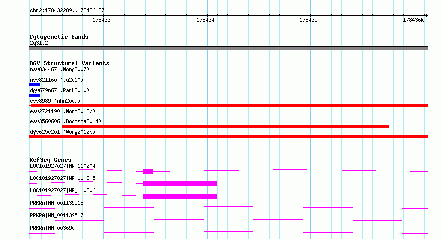 | Variant Type | CNV deletion | Copy Number | | Allele State | | Allele Origin | | Probe Count | | Validation Flag | | Merged Status | S | Merged Variants | esv2721190 | Supporting Variants | | Samples | SSM041 | Known Genes | MIR548N, PRKRA | Method | Sequencing | Analysis | Breakdancer:4 times standard deviation,VariationHunter:4 times standard deviation and at least 3 supportting reads | Platform | Illumina HiSeq 2000 | Comments | | Reference | Wong_et_al_2012b | Pubmed ID | 23290073 | Accession Number(s) | essv6707645