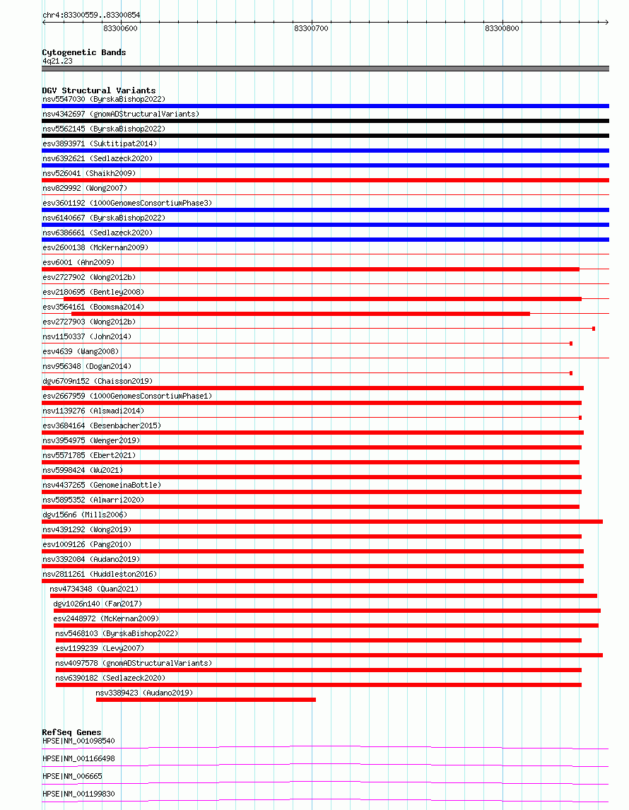 Variant DetailsVariant: essv6708001| Internal ID | 10122877 | | Landmark | | | Location Information | | | Cytoband | 4q21.23 | | Allele length | | Assembly | Allele length | | hg38 | 296 | | hg19 | 296 |