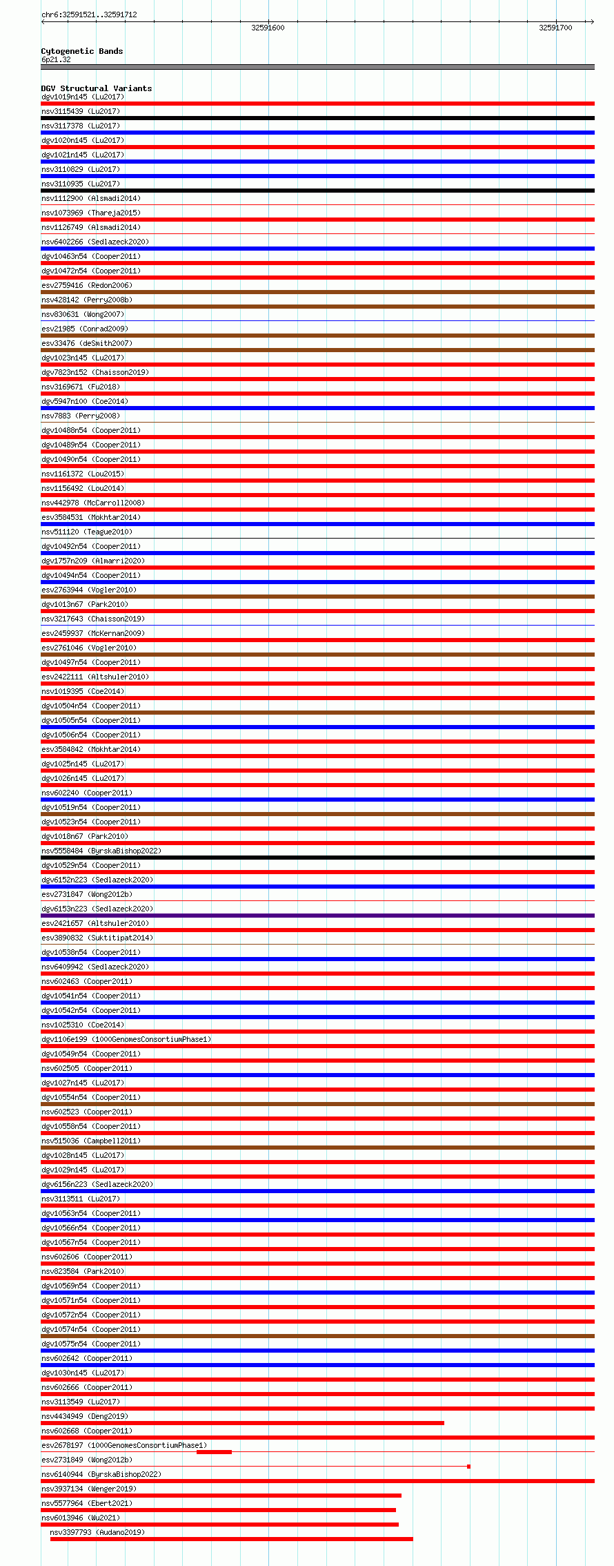 Variant DetailsVariant: essv6708413| Internal ID | 10122465 | | Landmark | | | Location Information | | | Cytoband | 6p21.32 | | Allele length | | Assembly | Allele length | | hg38 | 192 | | hg19 | 192 |