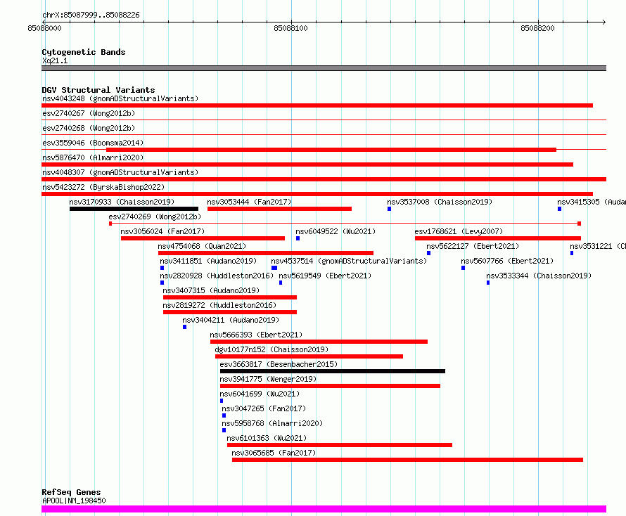 Variant DetailsVariant: essv6708870| Internal ID | 10122008 | | Landmark | | | Location Information | | | Cytoband | Xq21.1 | | Allele length | | Assembly | Allele length | | hg38 | 228 | | hg19 | 228 |