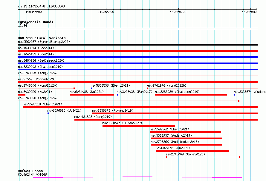 | | Variant Type | CNV deletion | | Copy Number | | | Allele State | | | Allele Origin | | | Probe Count | | | Validation Flag | | | Merged Status | S | | Merged Variants | esv2748008, esv2748005 | | Supporting Variants | | | Samples | SSM041 | | Known Genes | COL4A2 | | Method | Sequencing | | Analysis | Breakdancer:4 times standard deviation,VariationHunter:4 times standard deviation and at least 3 supportting reads | | Platform | Illumina HiSeq 2000 | | Comments | | | Reference | Wong_et_al_2012b | | Pubmed ID | 23290073 | | Accession Number(s) | essv6709678