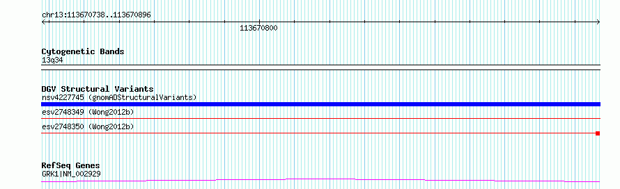 | Variant Type | CNV deletion | Copy Number | | Allele State | | Allele Origin | | Probe Count | | Validation Flag | | Merged Status | S | Merged Variants | esv2748350, esv2748349 | Supporting Variants | | Samples | SSM041 | Known Genes | GRK1 | Method | Sequencing | Analysis | Breakdancer:4 times standard deviation,VariationHunter:4 times standard deviation and at least 3 supportting reads | Platform | Illumina HiSeq 2000 | Comments | | Reference | Wong_et_al_2012b | Pubmed ID | 23290073 | Accession Number(s) | essv6709700