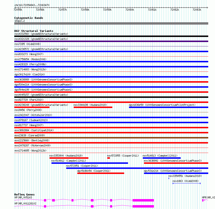 | Variant Type | CNV deletion | Copy Number | | Allele State | | Allele Origin | | Probe Count | | Validation Flag | | Merged Status | S | Merged Variants | esv2714685, esv2714683 | Supporting Variants | | Samples | SSM041 | Known Genes | HP, HPR | Method | Sequencing | Analysis | Breakdancer:4 times standard deviation,VariationHunter:4 times standard deviation and at least 3 supportting reads | Platform | Illumina HiSeq 2000 | Comments | | Reference | Wong_et_al_2012b | Pubmed ID | 23290073 | Accession Number(s) | essv6709970