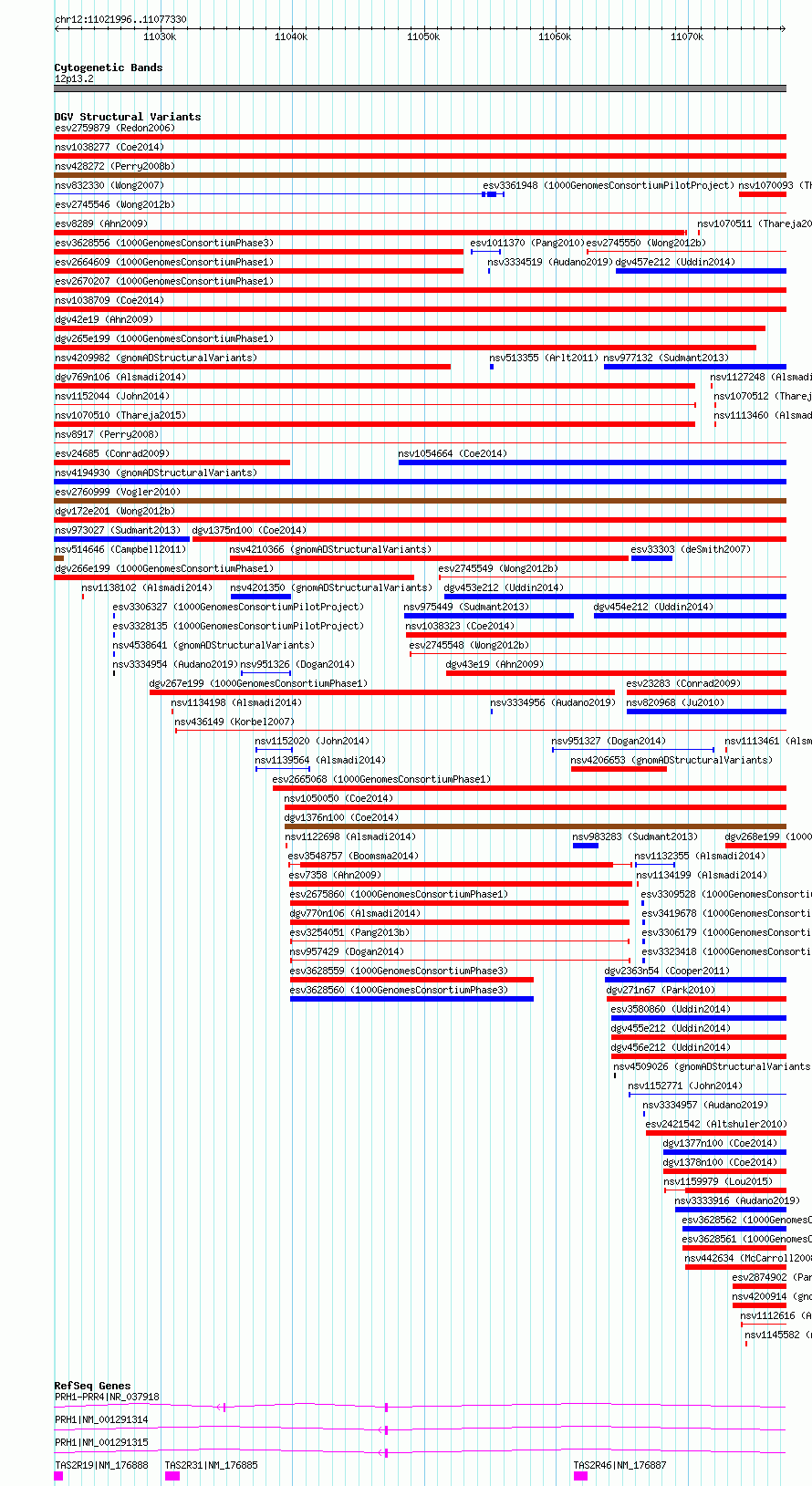 Variant DetailsVariant: essv6710955| Internal ID | 9649433 | | Landmark | | | Location Information | | | Cytoband | 12p13.2 | | Allele length | | Assembly | Allele length | | hg38 | 55335 | | hg19 | 55335 |