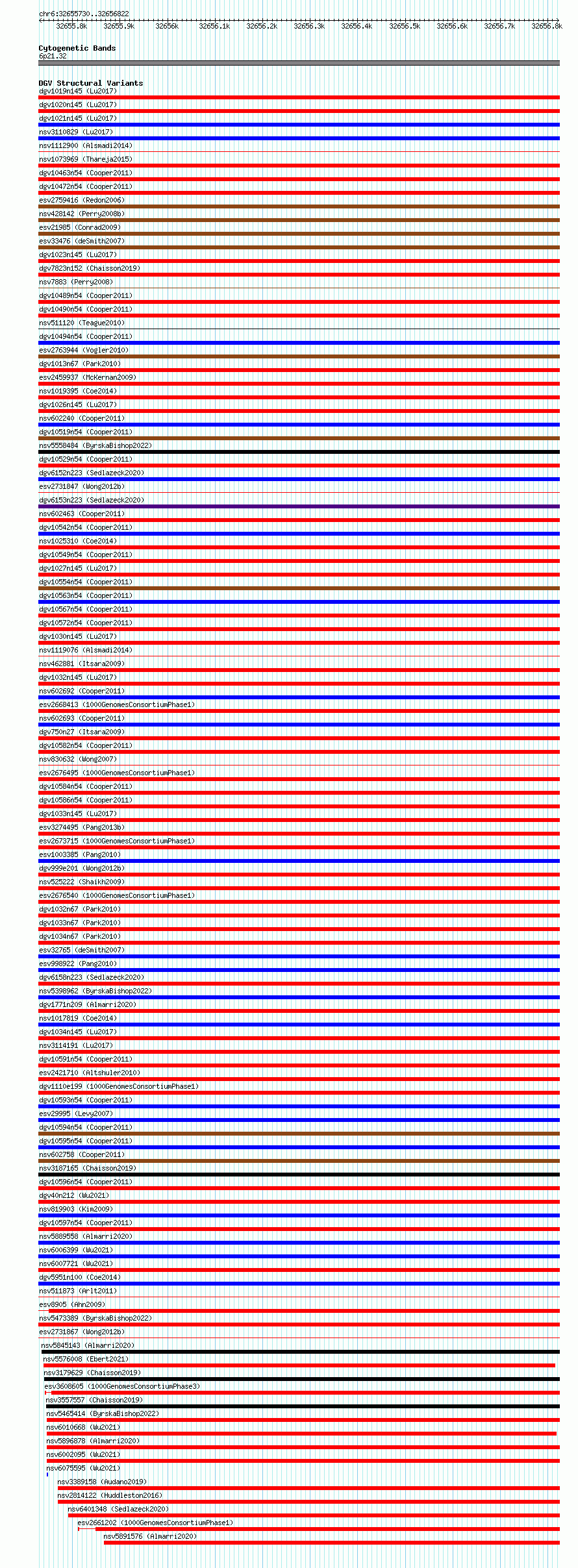 Variant DetailsVariant: essv6711831| Internal ID | 10124422 | | Landmark | | | Location Information | | | Cytoband | 6p21.32 | | Allele length | | Assembly | Allele length | | hg38 | 1093 | | hg19 | 1093 |