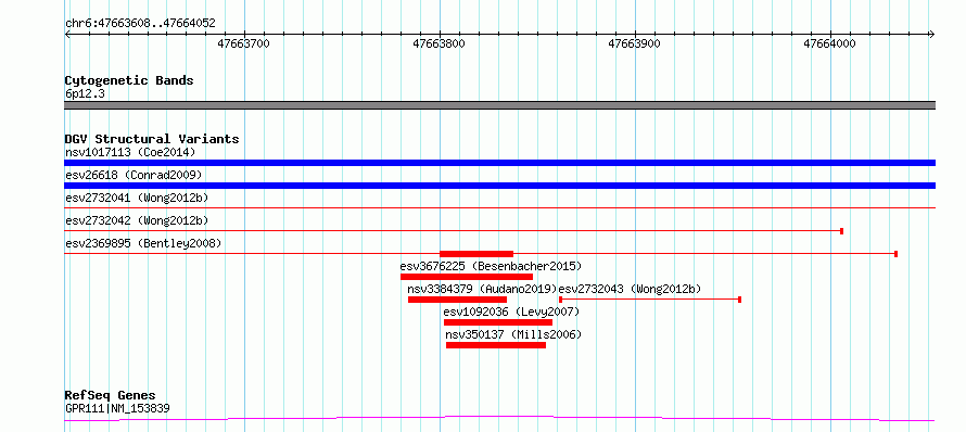 | | Variant Type | CNV deletion | | Copy Number | | | Allele State | | | Allele Origin | | | Probe Count | | | Validation Flag | | | Merged Status | S | | Merged Variants | esv2732042, esv2732041 | | Supporting Variants | | | Samples | SSM042 | | Known Genes | GPR111 | | Method | Sequencing | | Analysis | Breakdancer:4 times standard deviation,VariationHunter:4 times standard deviation and at least 3 supportting reads | | Platform | Illumina HiSeq 2000 | | Comments | | | Reference | Wong_et_al_2012b | | Pubmed ID | 23290073 | | Accession Number(s) | essv6711857