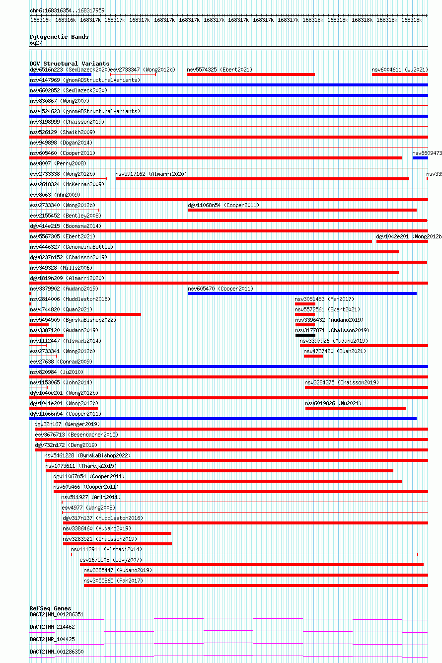 Variant DetailsVariant: essv6711982| Internal ID | 10124557 | | Landmark | | | Location Information | | | Cytoband | 6q27 | | Allele length | | Assembly | Allele length | | hg38 | 1606 | | hg19 | 1606 |