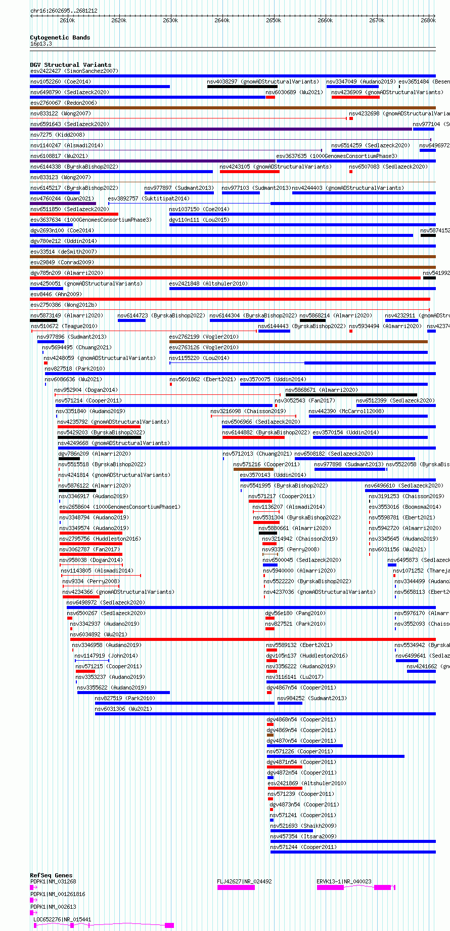 Variant DetailsVariant: essv6713401| Internal ID | 10125834 | | Landmark | | | Location Information | | | Cytoband | 16p13.3 | | Allele length | | Assembly | Allele length | | hg38 | 78518 | | hg19 | 78518 |