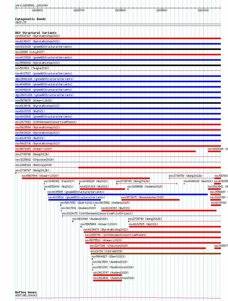 Variant DetailsVariant: essv6715989| Internal ID | 10127871 | | Landmark | | | Location Information | | | Cytoband | Xp22.33 | | Allele length | | Assembly | Allele length | | hg38 | 495 | | hg19 | 495 |