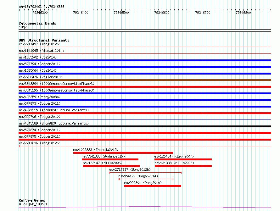 | | Variant Type | CNV deletion | | Copy Number | | | Allele State | | | Allele Origin | | | Probe Count | | | Validation Flag | | | Merged Status | S | | Merged Variants | esv2717636, esv2717497 | | Supporting Variants | | | Samples | SSM006 | | Known Genes | ATP9B | | Method | Sequencing | | Analysis | Breakdancer:4 times standard deviation,VariationHunter:4 times standard deviation and at least 3 supportting reads | | Platform | Illumina HiSeq 2000 | | Comments | | | Reference | Wong_et_al_2012b | | Pubmed ID | 23290073 | | Accession Number(s) | essv6716065