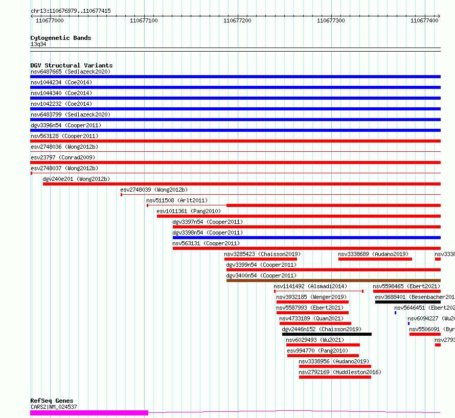 Variant DetailsVariant: essv6717012| Internal ID | 10128792 | | Landmark | | | Location Information | | | Cytoband | 13q34 | | Allele length | | Assembly | Allele length | | hg38 | 437 | | hg19 | 437 |