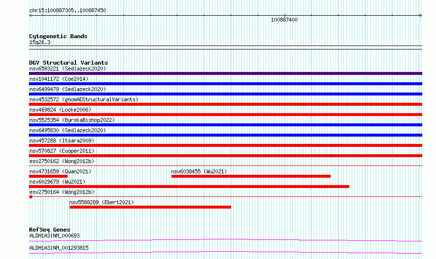 | | Variant Type | CNV deletion | | Copy Number | | | Allele State | | | Allele Origin | | | Probe Count | | | Validation Flag | | | Merged Status | S | | Merged Variants | esv2750164, esv2750162 | | Supporting Variants | | | Samples | SSM043 | | Known Genes | ALDH1A3 | | Method | Sequencing | | Analysis | Breakdancer:4 times standard deviation,VariationHunter:4 times standard deviation and at least 3 supportting reads | | Platform | Illumina HiSeq 2000 | | Comments | | | Reference | Wong_et_al_2012b | | Pubmed ID | 23290073 | | Accession Number(s) | essv6717249