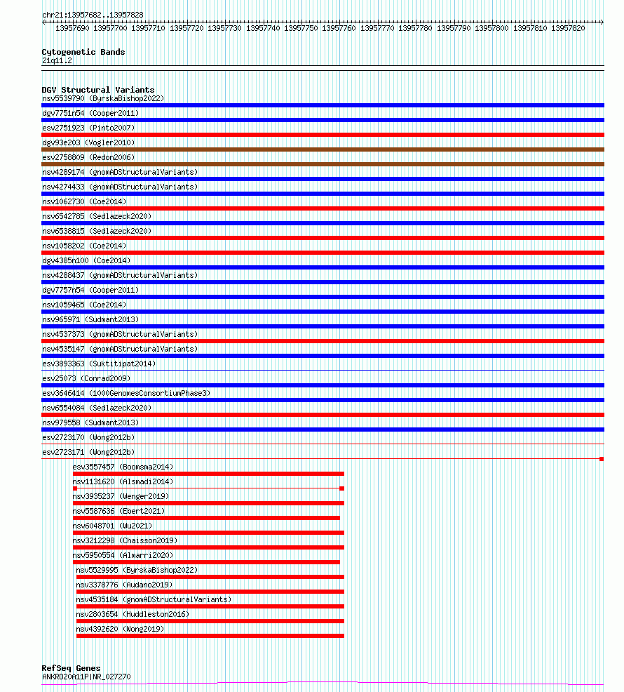 Variant DetailsVariant: essv6718044| Internal ID | 10129720 | | Landmark | | | Location Information | | | Cytoband | 21q11.2 | | Allele length | | Assembly | Allele length | | hg38 | 147 | | hg19 | 147 |