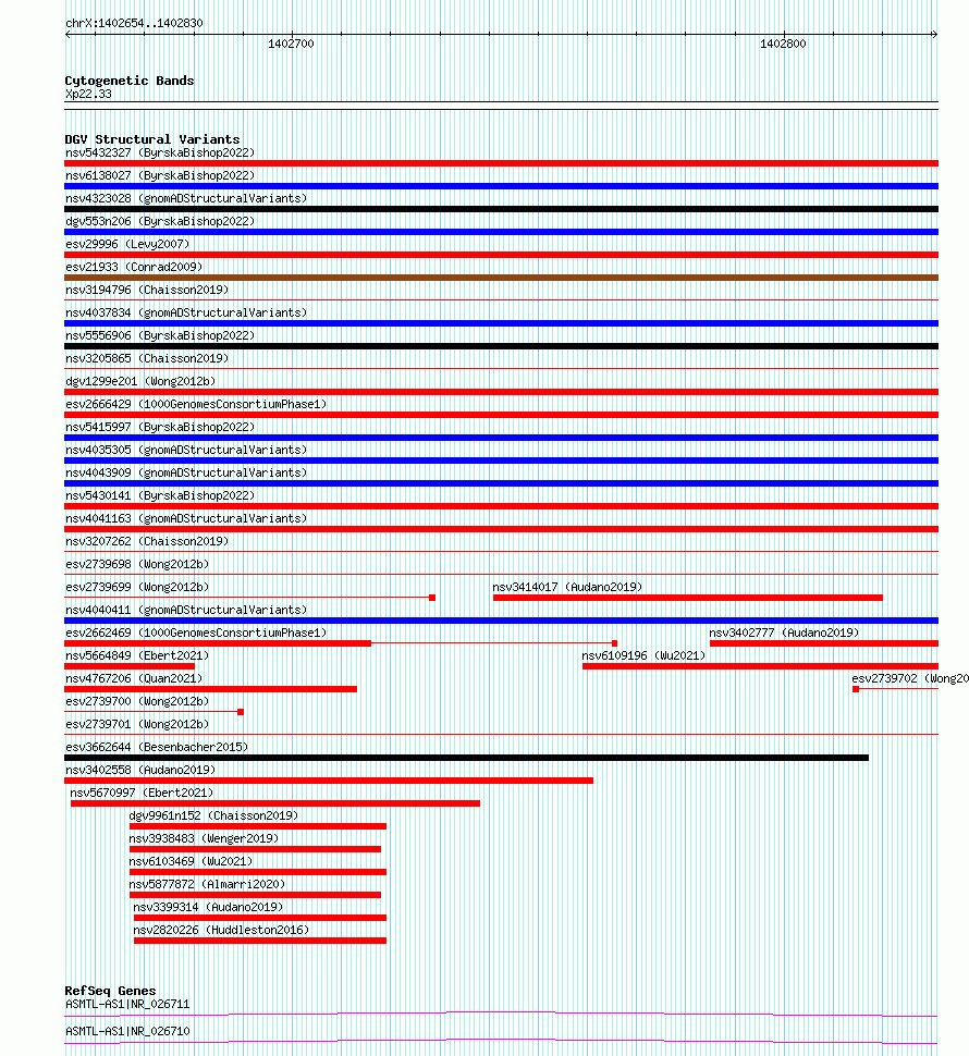 Variant DetailsVariant: essv6719889| Internal ID | 10131627 | | Landmark | | | Location Information | | | Cytoband | Xp22.33 | | Allele length | | Assembly | Allele length | | hg38 | 177 | | hg19 | 177 |