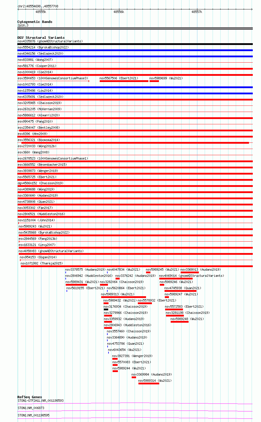 Variant DetailsVariant: essv6721077| Internal ID | 9997244 | | Landmark | | | Location Information | | | Cytoband | 2p16.3 | | Allele length | | Assembly | Allele length | | hg38 | 3011 | | hg19 | 3011 |