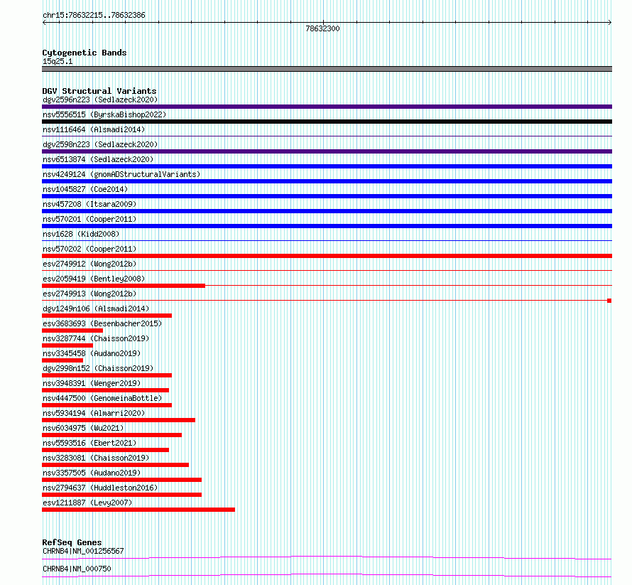 | | Variant Type | CNV deletion | | Copy Number | | | Allele State | | | Allele Origin | | | Probe Count | | | Validation Flag | | | Merged Status | S | | Merged Variants | esv2749912, esv2749913 | | Supporting Variants | | | Samples | SSM044 | | Known Genes | CHRNB4 | | Method | Sequencing | | Analysis | Breakdancer:4 times standard deviation,VariationHunter:4 times standard deviation and at least 3 supportting reads | | Platform | Illumina HiSeq 2000 | | Comments | | | Reference | Wong_et_al_2012b | | Pubmed ID | 23290073 | | Accession Number(s) | essv6721103