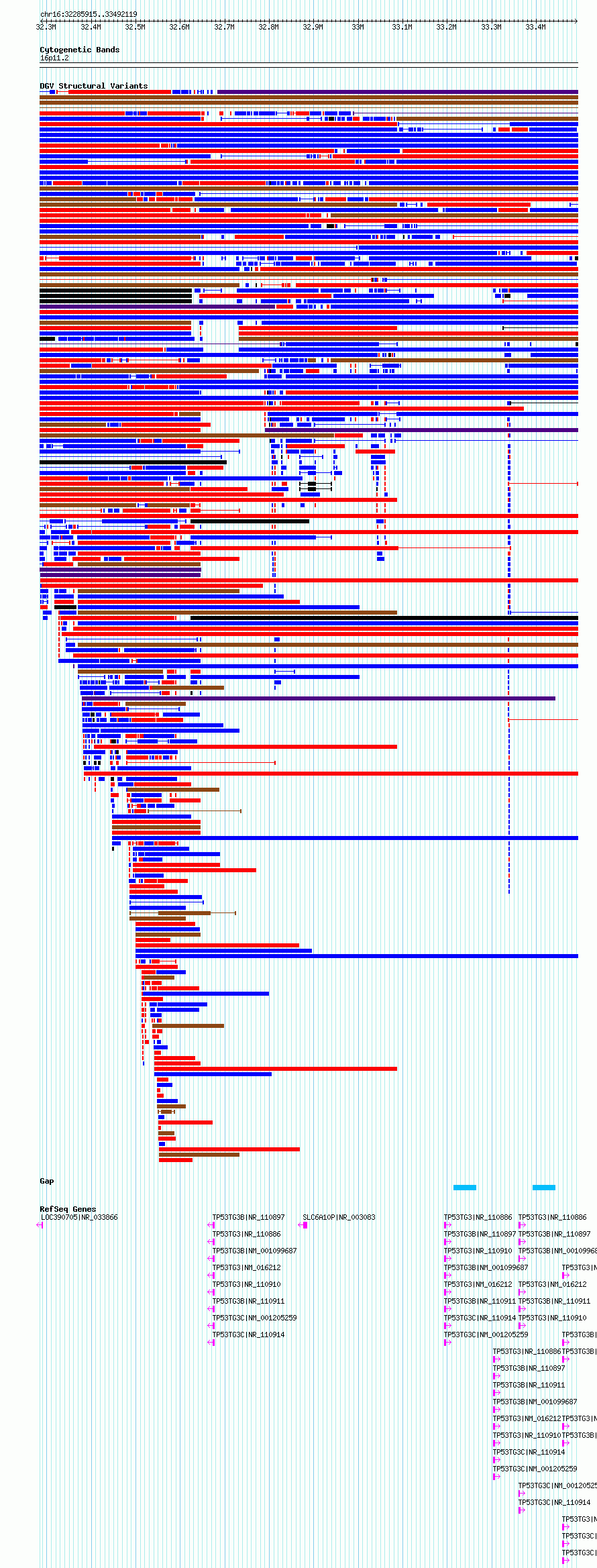 Variant DetailsVariant: essv6721172| Internal ID | 10130473 | | Landmark | | | Location Information | | | Cytoband | 16p11.2 | | Allele length | | Assembly | Allele length | | hg38 | 1206205 | | hg19 | 997351 |