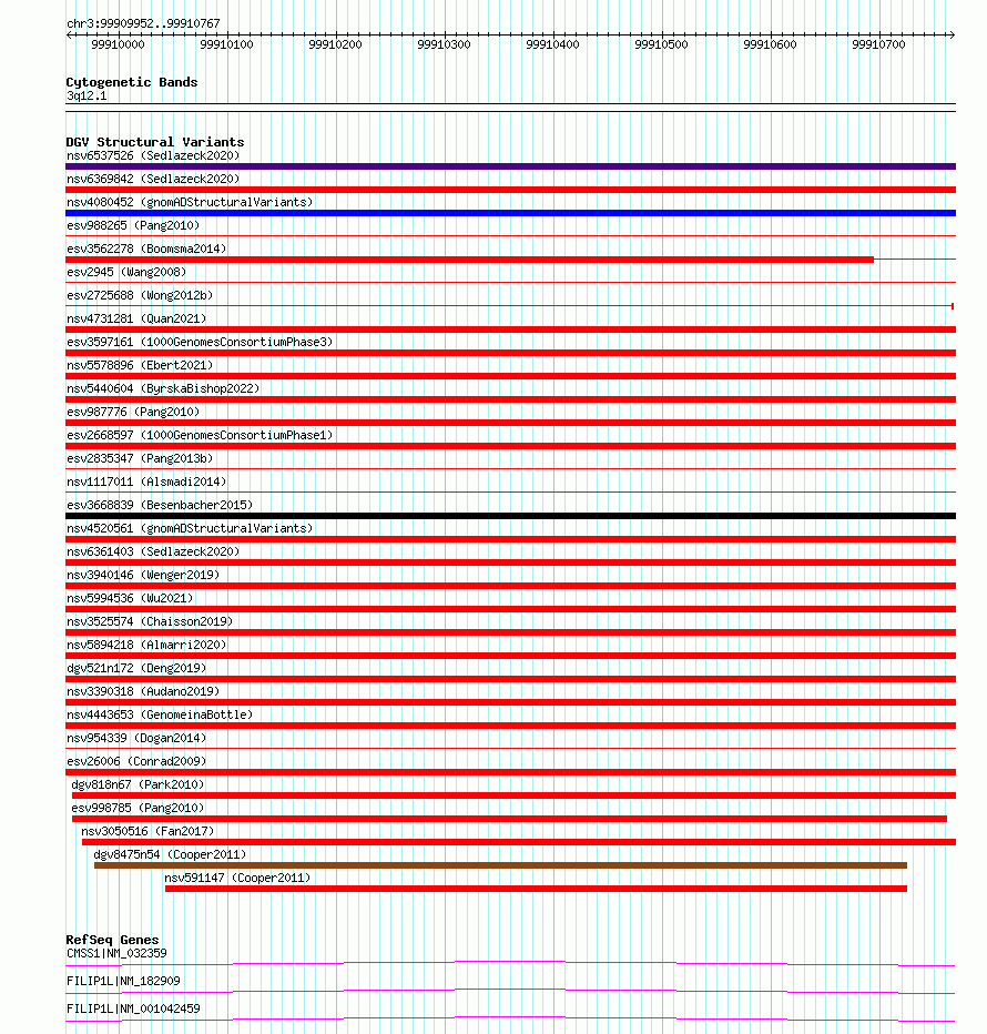 | | Variant Type | CNV deletion | | Copy Number | | | Allele State | | | Allele Origin | | | Probe Count | | | Validation Flag | | | Merged Status | S | | Merged Variants | esv2725688 | | Supporting Variants | | | Samples | SSM045 | | Known Genes | CMSS1, FILIP1L, MIR548G | | Method | Sequencing | | Analysis | Breakdancer:4 times standard deviation,VariationHunter:4 times standard deviation and at least 3 supportting reads | | Platform | Illumina HiSeq 2000 | | Comments | | | Reference | Wong_et_al_2012b | | Pubmed ID | 23290073 | | Accession Number(s) | essv6722578