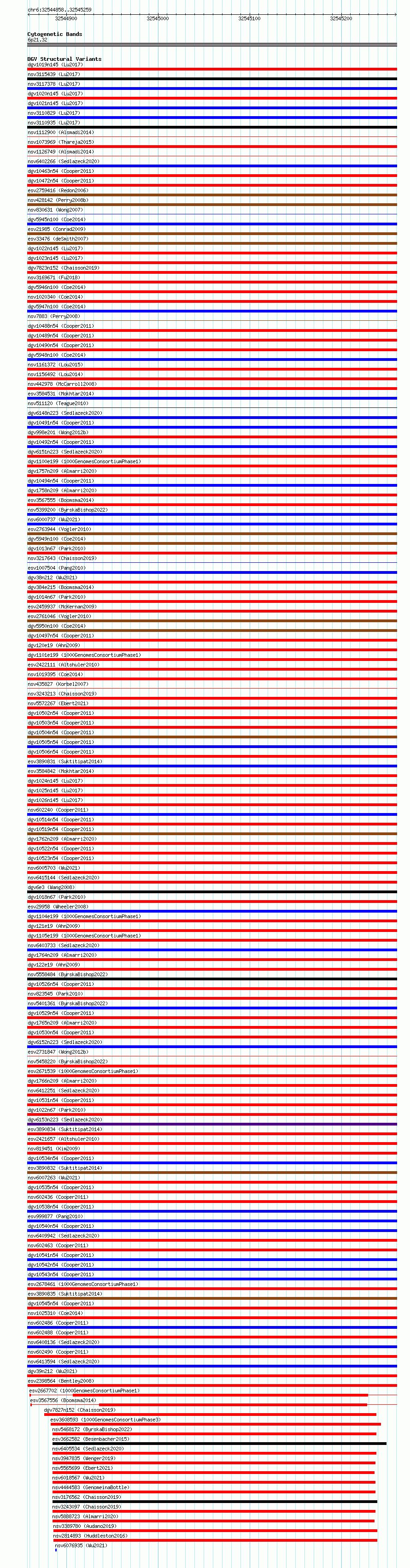 Variant DetailsVariant: essv6723196| Internal ID | 10134358 | | Landmark | | | Location Information | | | Cytoband | 6p21.32 | | Allele length | | Assembly | Allele length | | hg38 | 402 | | hg19 | 402 |