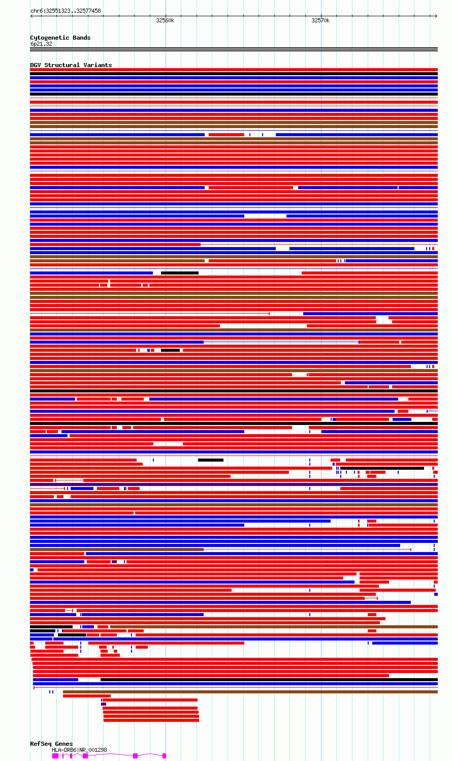 Variant DetailsVariant: essv6723228| Internal ID | 10134387 | | Landmark | | | Location Information | | | Cytoband | 6p21.32 | | Allele length | | Assembly | Allele length | | hg38 | 26136 | | hg19 | 26136 |
