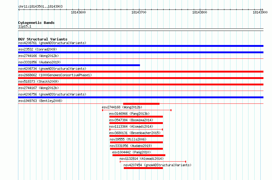 Variant DetailsVariant: essv6724339| Internal ID | 9788702 | | Landmark | | | Location Information | | | Cytoband | 11p15.1 | | Allele length | | Assembly | Allele length | | hg38 | 403 | | hg19 | 403 |