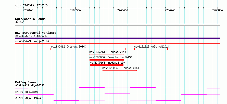 | | Variant Type | CNV deletion | | Copy Number | | | Allele State | | | Allele Origin | | | Probe Count | | | Validation Flag | | | Merged Status | S | | Merged Variants | esv2727079 | | Supporting Variants | | | Samples | SSM046 | | Known Genes | AFAP1, AFAP1-AS1 | | Method | Sequencing | | Analysis | Breakdancer:4 times standard deviation,VariationHunter:4 times standard deviation and at least 3 supportting reads | | Platform | Illumina HiSeq 2000 | | Comments | | | Reference | Wong_et_al_2012b | | Pubmed ID | 23290073 | | Accession Number(s) | essv6726560