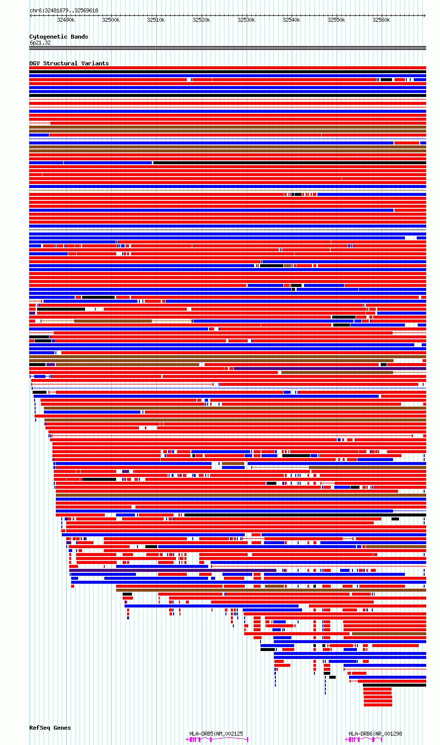 Variant DetailsVariant: essv6727097| Internal ID | 10137870 | | Landmark | | | Location Information | | | Cytoband | 6p21.32 | | Allele length | | Assembly | Allele length | | hg38 | 87740 | | hg19 | 87740 |