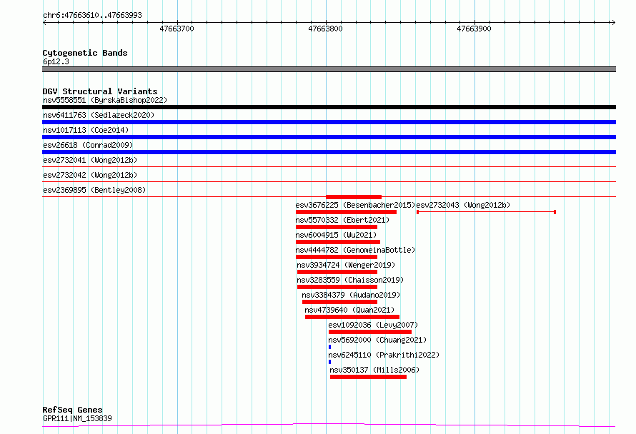 Variant DetailsVariant: essv6727130| Internal ID | 10137900 | | Landmark | | | Location Information | | | Cytoband | 6p12.3 | | Allele length | | Assembly | Allele length | | hg38 | 384 | | hg19 | 384 |