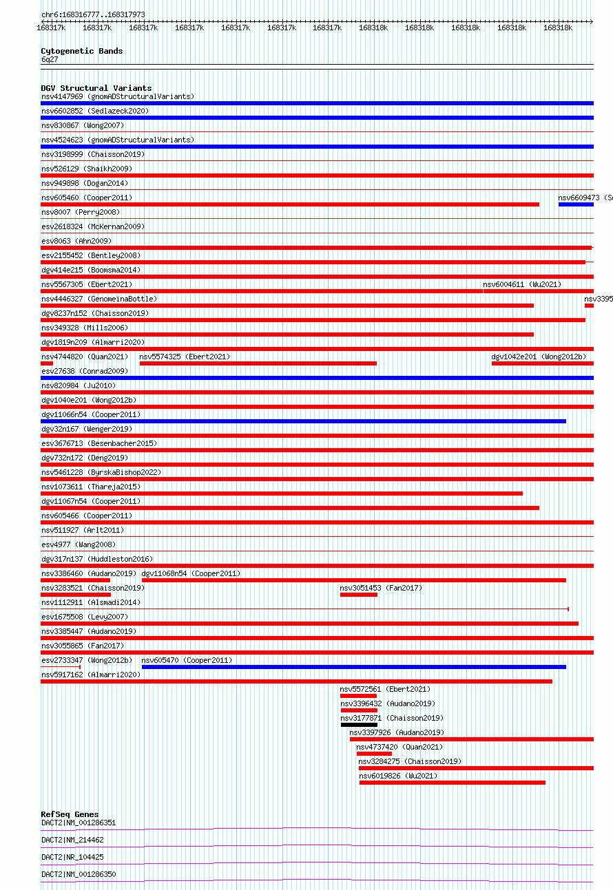 | | Variant Type | CNV deletion | | Copy Number | | | Allele State | | | Allele Origin | | | Probe Count | | | Validation Flag | | | Merged Status | S | | Merged Variants | esv2733348, esv2733346, esv2733342, esv2733344 | | Supporting Variants | | | Samples | SSM046 | | Known Genes | DACT2 | | Method | Sequencing | | Analysis | Breakdancer:4 times standard deviation,VariationHunter:4 times standard deviation and at least 3 supportting reads | | Platform | Illumina HiSeq 2000 | | Comments | | | Reference | Wong_et_al_2012b | | Pubmed ID | 23290073 | | Accession Number(s) | essv6727266