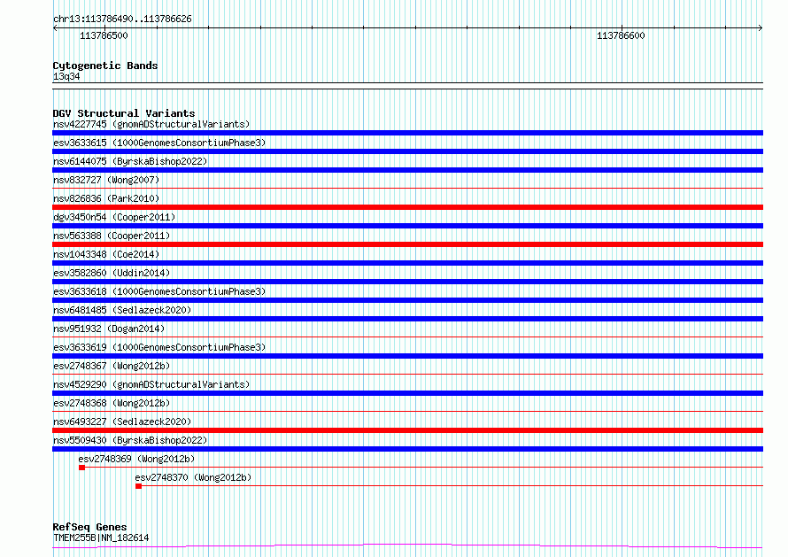 Variant DetailsVariant: essv6728559| Internal ID | 10139185 | | Landmark | | | Location Information | | | Cytoband | 13q34 | | Allele length | | Assembly | Allele length | | hg38 | 137 | | hg19 | 137 |