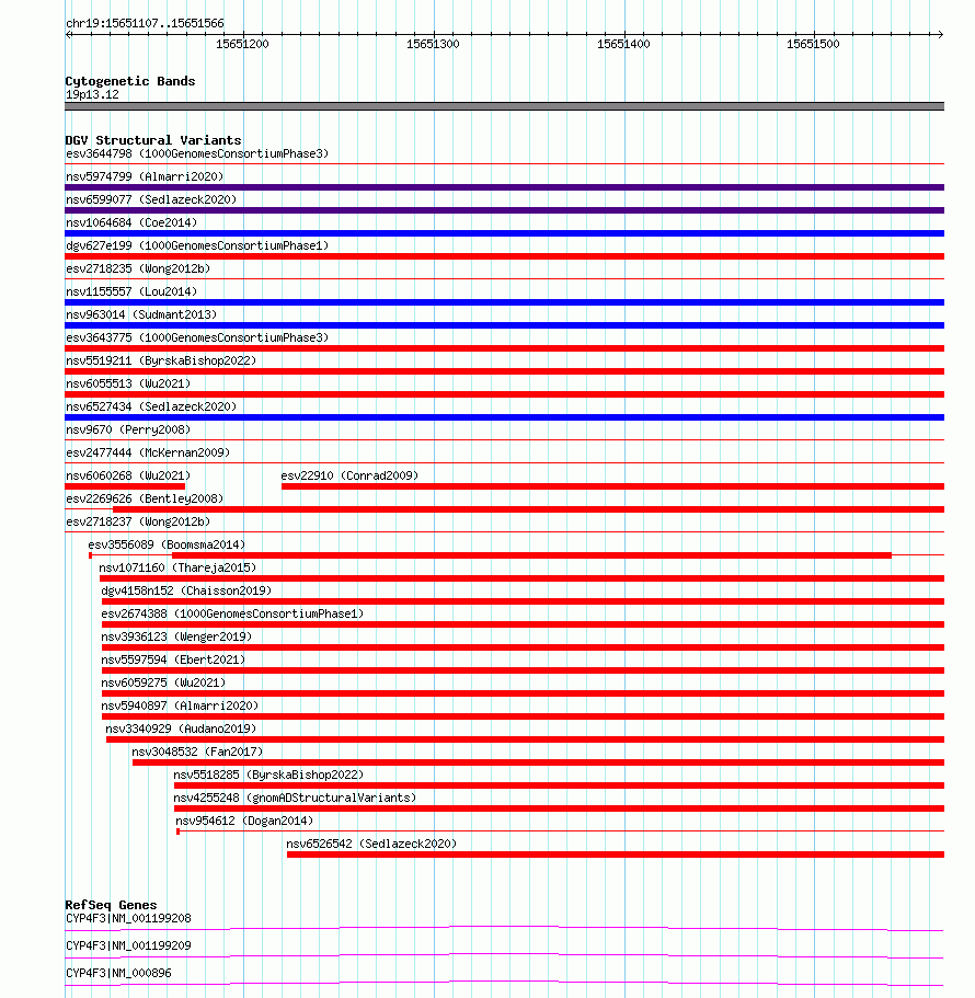| | Variant Type | CNV deletion | | Copy Number | | | Allele State | | | Allele Origin | | | Probe Count | | | Validation Flag | | | Merged Status | S | | Merged Variants | esv2718235, esv2718237 | | Supporting Variants | | | Samples | SSM046 | | Known Genes | CYP4F3 | | Method | Sequencing | | Analysis | Breakdancer:4 times standard deviation,VariationHunter:4 times standard deviation and at least 3 supportting reads | | Platform | Illumina HiSeq 2000 | | Comments | | | Reference | Wong_et_al_2012b | | Pubmed ID | 23290073 | | Accession Number(s) | essv6729305