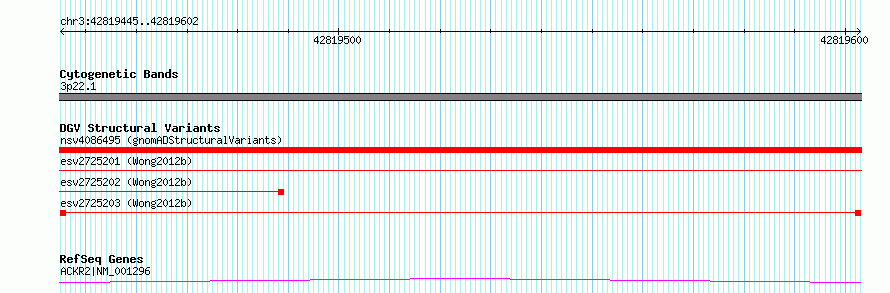 | Variant Type | CNV deletion | Copy Number | | Allele State | | Allele Origin | | Probe Count | | Validation Flag | | Merged Status | S | Merged Variants | esv2725201, esv2725203 | Supporting Variants | | Samples | SSM047 | Known Genes | ACKR2 | Method | Sequencing | Analysis | Breakdancer:4 times standard deviation,VariationHunter:4 times standard deviation and at least 3 supportting reads | Platform | Illumina HiSeq 2000 | Comments | | Reference | Wong_et_al_2012b | Pubmed ID | 23290073 | Accession Number(s) | essv6730129