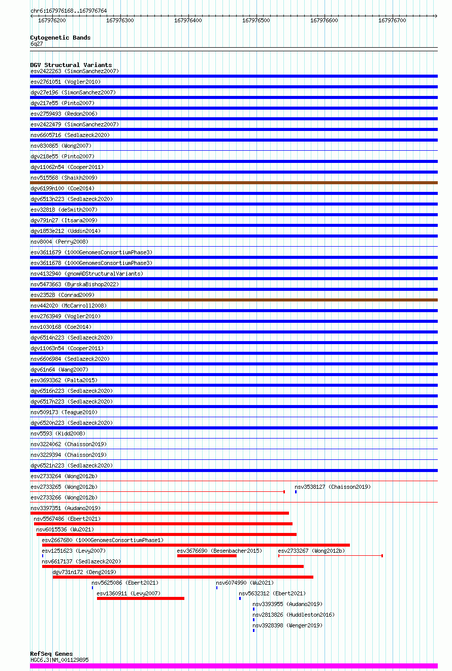 Variant DetailsVariant: essv6731014| Internal ID | 10141394 | | Landmark | | | Location Information | | | Cytoband | 6q27 | | Allele length | | Assembly | Allele length | | hg38 | 597 | | hg19 | 597 |