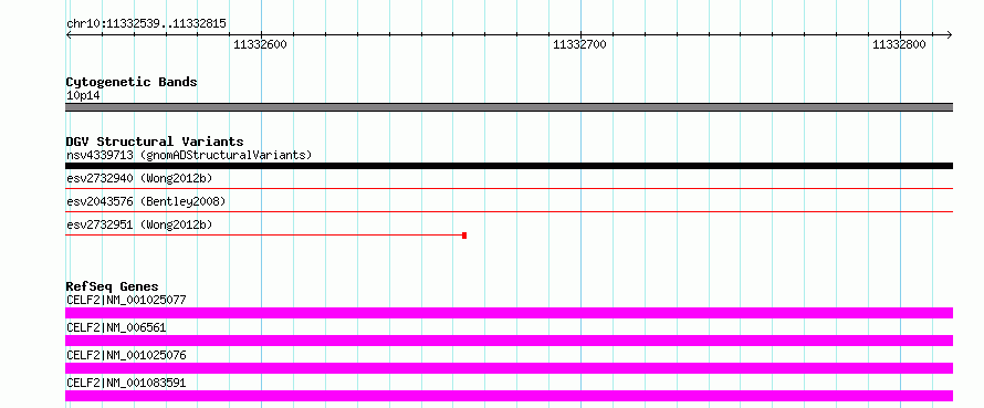 | | Variant Type | CNV deletion | | Copy Number | | | Allele State | | | Allele Origin | | | Probe Count | | | Validation Flag | | | Merged Status | S | | Merged Variants | esv2732951, esv2732940 | | Supporting Variants | | | Samples | SSM047 | | Known Genes | CELF2 | | Method | Sequencing | | Analysis | Breakdancer:4 times standard deviation,VariationHunter:4 times standard deviation and at least 3 supportting reads | | Platform | Illumina HiSeq 2000 | | Comments | | | Reference | Wong_et_al_2012b | | Pubmed ID | 23290073 | | Accession Number(s) | essv6731771