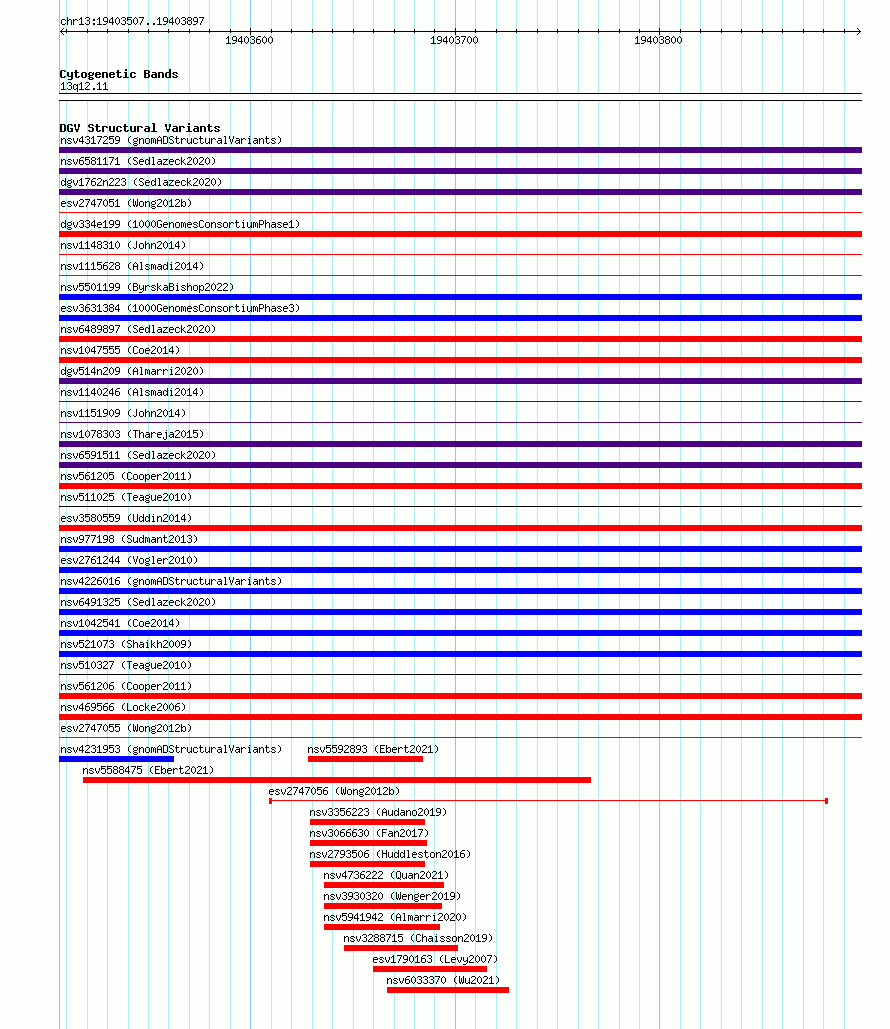 Variant DetailsVariant: essv6732245| Internal ID | 10143064 | | Landmark | | | Location Information | | | Cytoband | 13q12.11 | | Allele length | | Assembly | Allele length | | hg38 | 391 | | hg19 | 391 |
